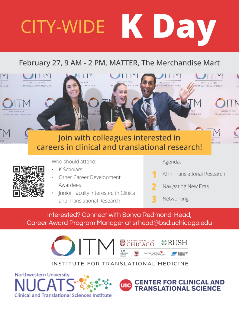 Join ITM partners University of Illinois Chicago Center for Clinical and Translational Science and Northwestern University Clinical and Translational Science Institute for the 2026 Chicagoland K Day! Register by Feb. 20 to save your seat!